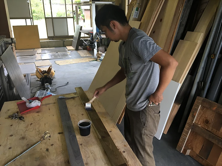 そして、今回は床材もパネルに合わせてオリジナルの仕上げとしています。志賀ちゃんが5年間暖めてきた特殊な自然塗料(神代塗装)を施しました。