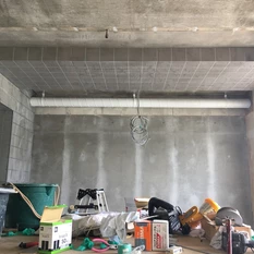 既存天井をスケルトンの現しとするので、クロスの洗い工事をしてもらいました。水を吹き付けながら、クロスの接着剤を浮かしながら洗って行きます。そうすることでこのようにきれいに下地が現れます。