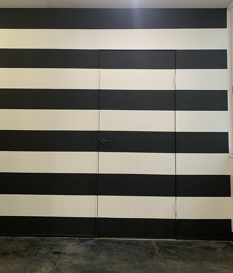 アンドボーダーさまのロゴの通り、白と黒のボーダーを床から天井まで11分割で割り付けています。扉のレバーハンドルも黒の中心に、扉丁番も白の中心に配置するよう計画。
