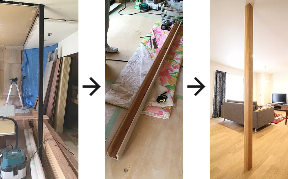 鉄骨の柱は建具屋さんの手で美しく仕上げられています。オークの無垢材で作ったボックス形状のものを巻き付けています。